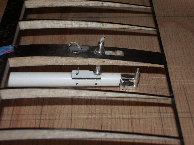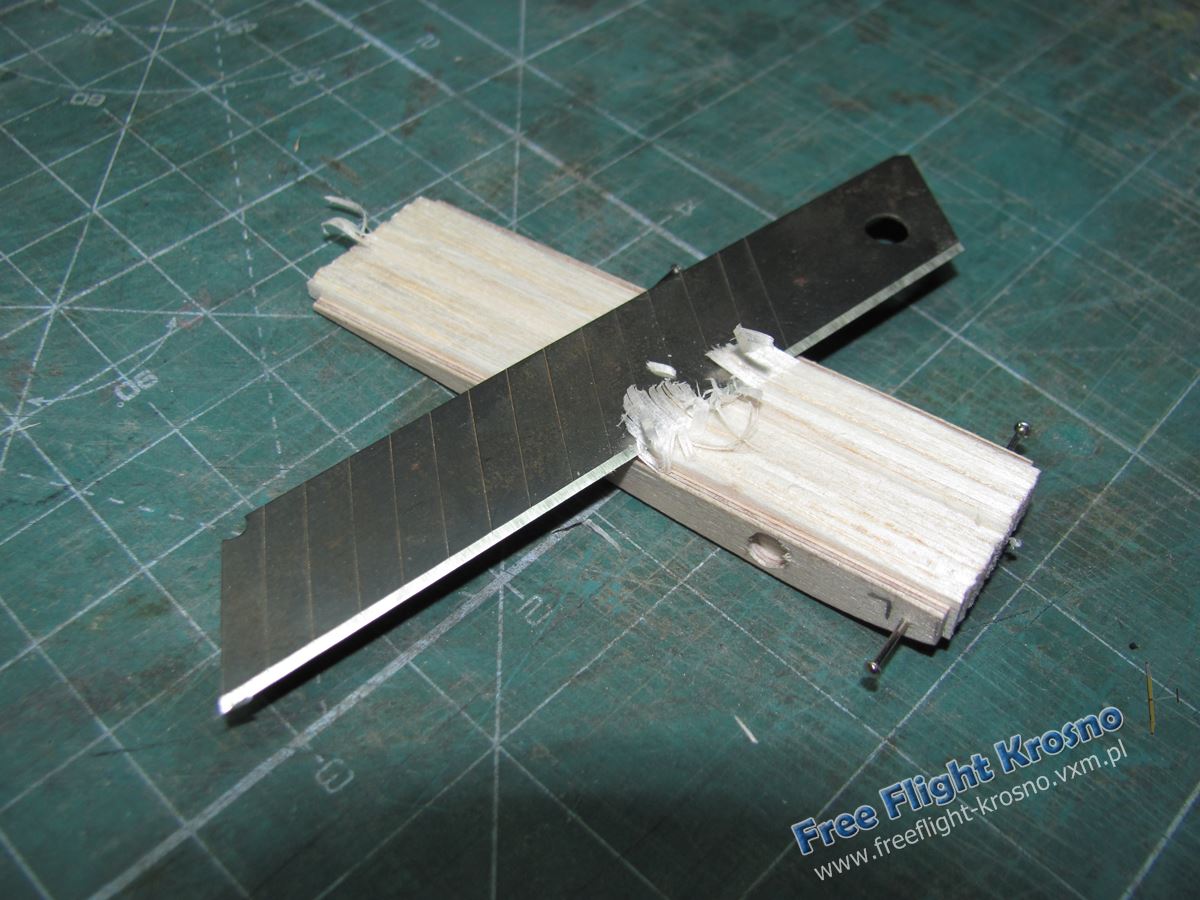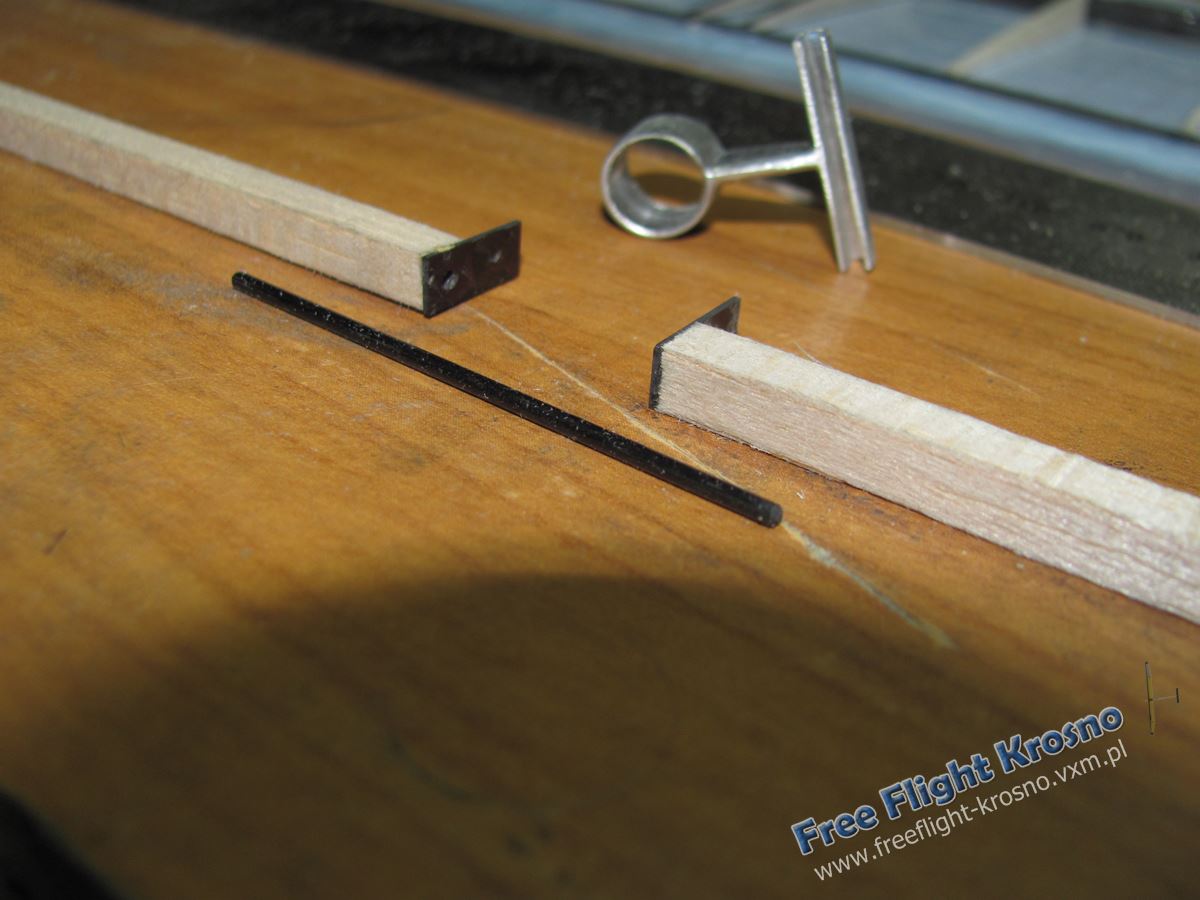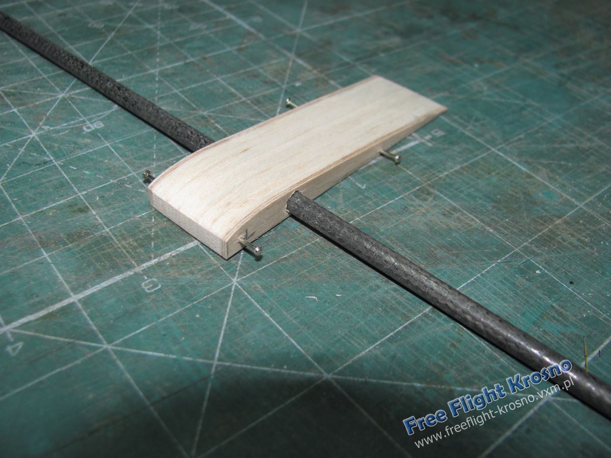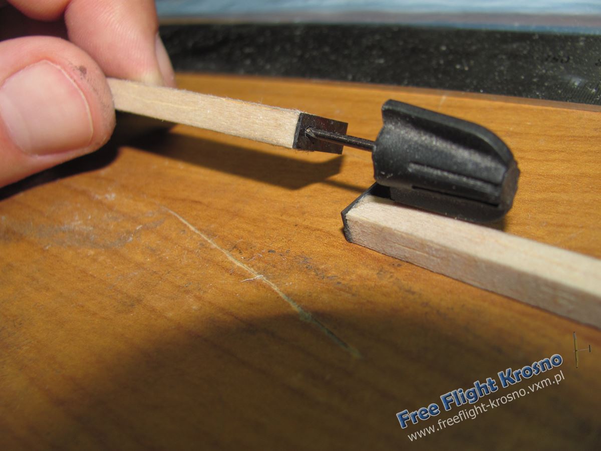 Przy mechanicznym wyłączniku czasowym należy wkleić tu płytkę laminatową z otworem mocującym słupek regulacyjny do lotu swobodnego lub wykonać otwór w wypełnieniu z balsy na całą wysokość profilu.