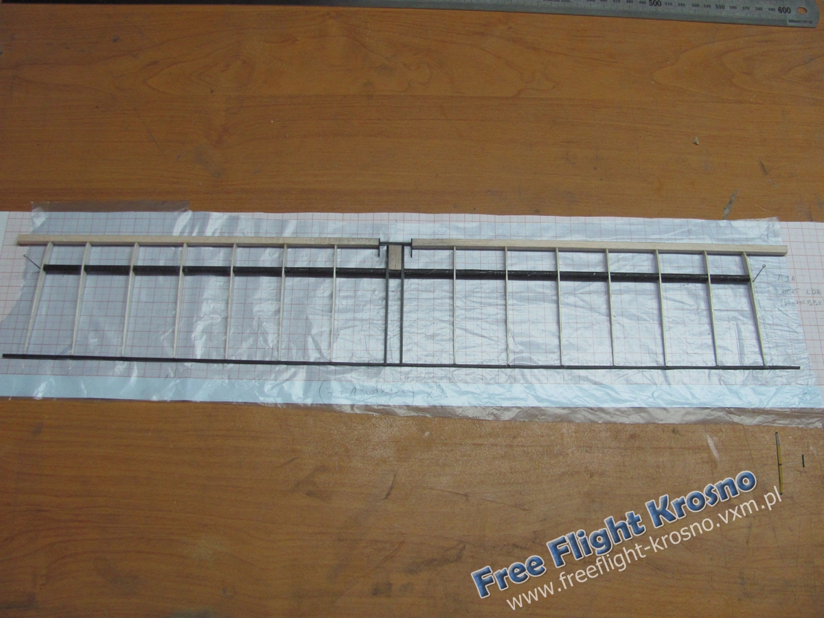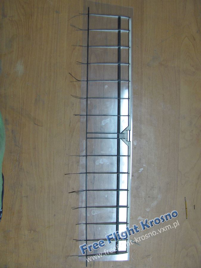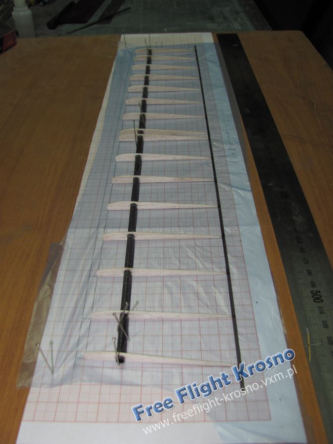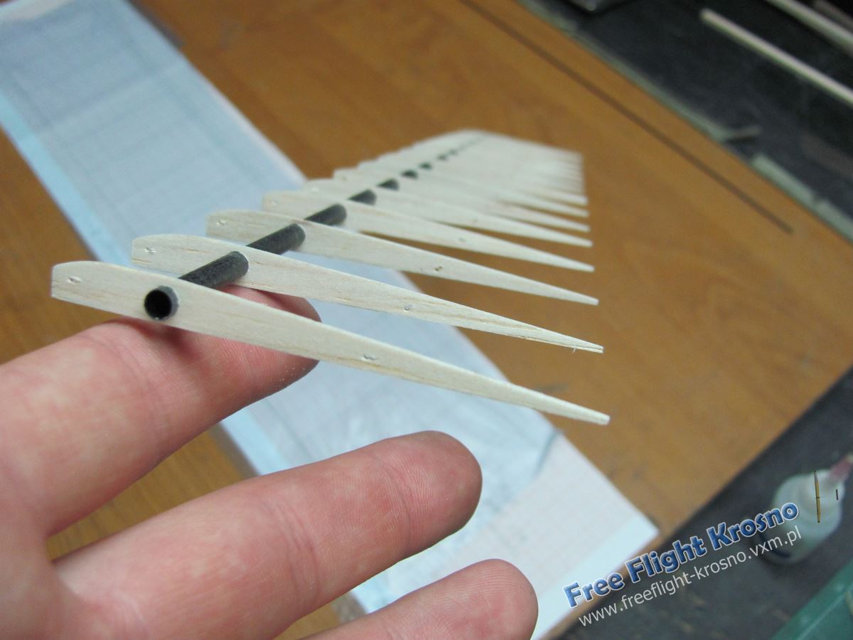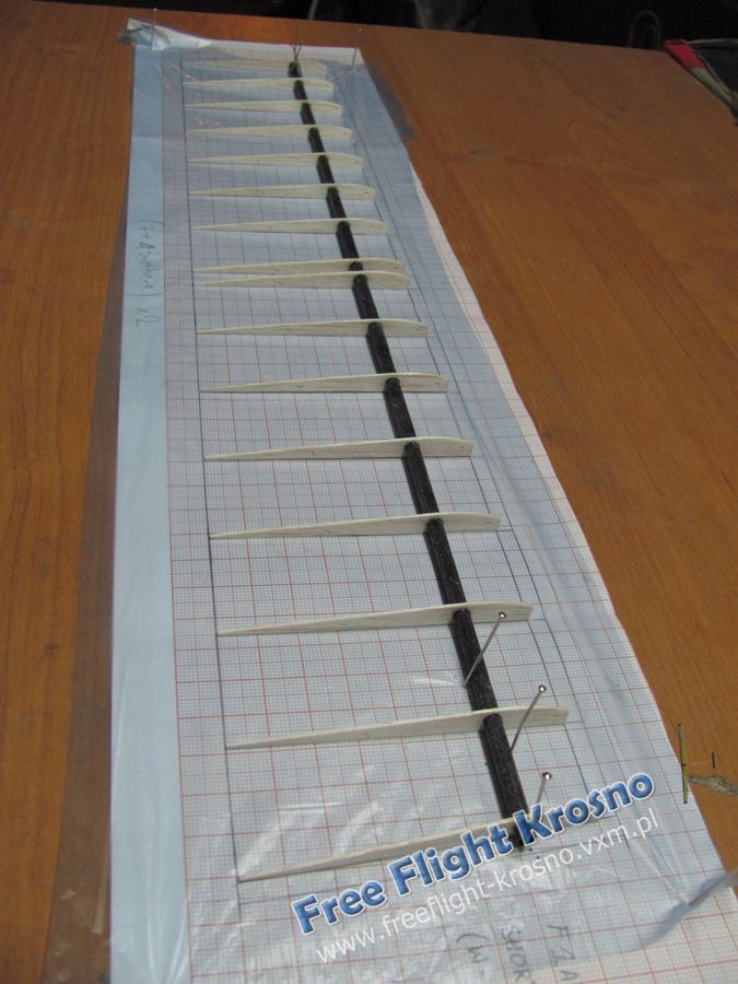 Żeberka zostały „nadziane” na rurkę, początkowo bez żadnego kleju i wstępnie ustawione. Później rurkę przyłapałem szpilkami do deski z planem, tak aby się nie przesuwała i dokładnie ustawiłem żeberka. Następnie klej CA z igłą i każde żeberko po kolei przykleiłem do rurki.