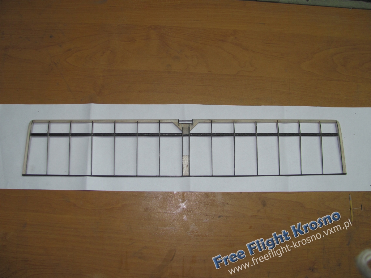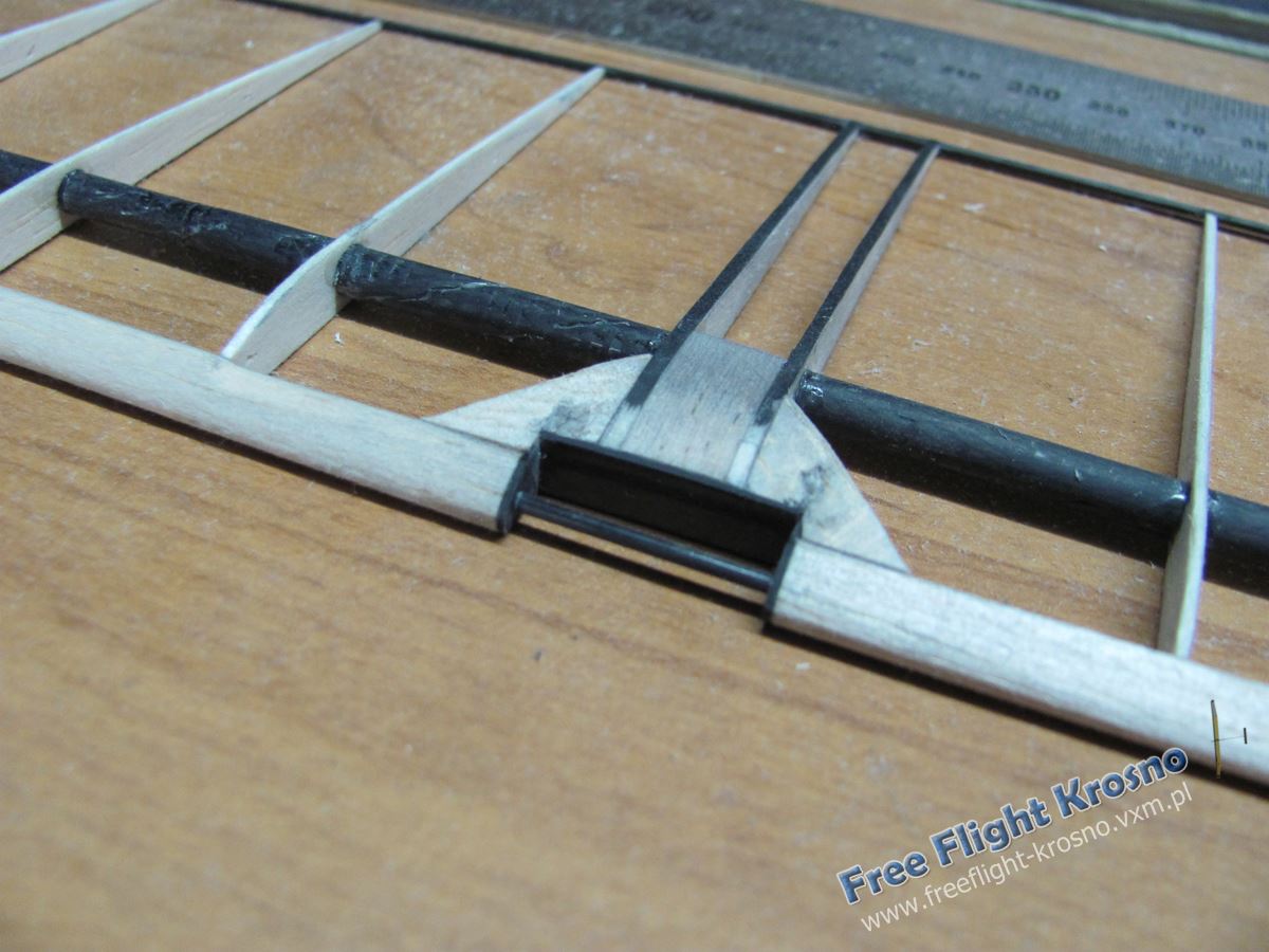 Następnie można dociąć natarcie na końcach do odpowiedniej długości. Później w środkowej części statecznika, przy pręcie mocującym wkleiłem dopasowane trójkąty wzmacniające (w które jak widać wpuszczone są elementy mocujące pręt) i  dodatkowy kawałem wycięty z płytki węglowej 0,7mm od czoła. Przed tym jednak na dwa środkowe żeberka przykleiłem nakładki. Dlaczego przed? Po to aby nakładki nie wystawały i aby trójkąty na wysokość były doszlifowane do nich. Przestrzeń pomiędzy żeberkami w przedniej części przed dźwigarem została wypełniona balsą średniej twardości – tu zostanie później wklejony haczyk do zaczepiania gumki. Ten element można wykonać całkowicie inaczej, ja robię to tak i z powodzeniem działa to od kilku lat w trzech innych statecznikach. Jeśli  mocowanie będzie innego typu ten element należy pominąć.