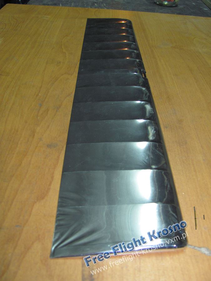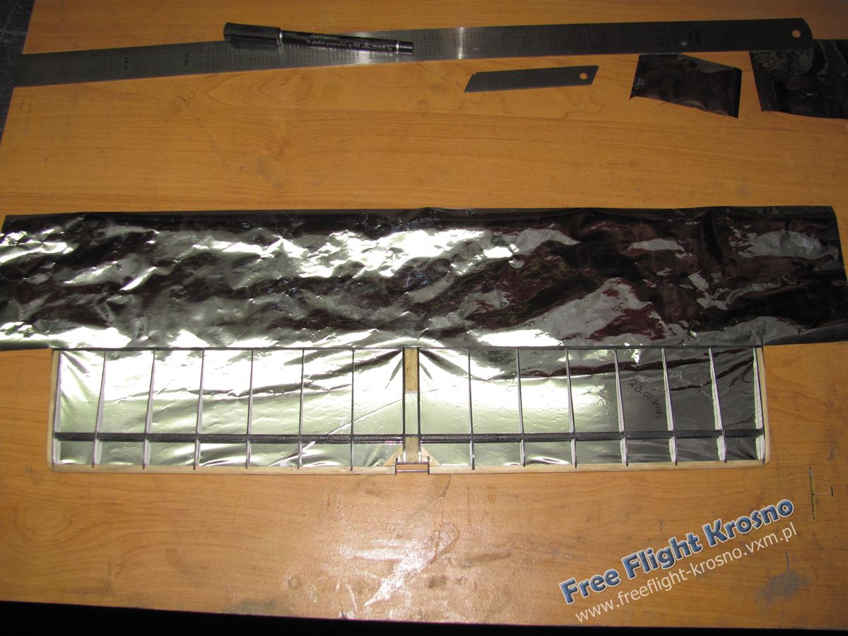Statecznik oklejony został mylarem. Na zdjęciach podczas oklejania i po wstępnym naprężeniu mylaru. Pozostaje wkleić haczyk do mocowania rurki i pręt, który będzie wchodził w widelec poruszający statecznikiem.