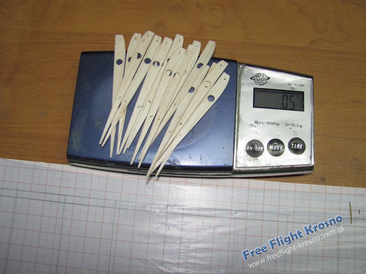 Otwór na dźwigar wywierciłem wiertłem 3mm, a później rozpiłowałem iglakiem do 4mm – oczywiście w szablonach otwory były wywiercone wcześniej. Waga kompletu żeberek to około 0,5grama.